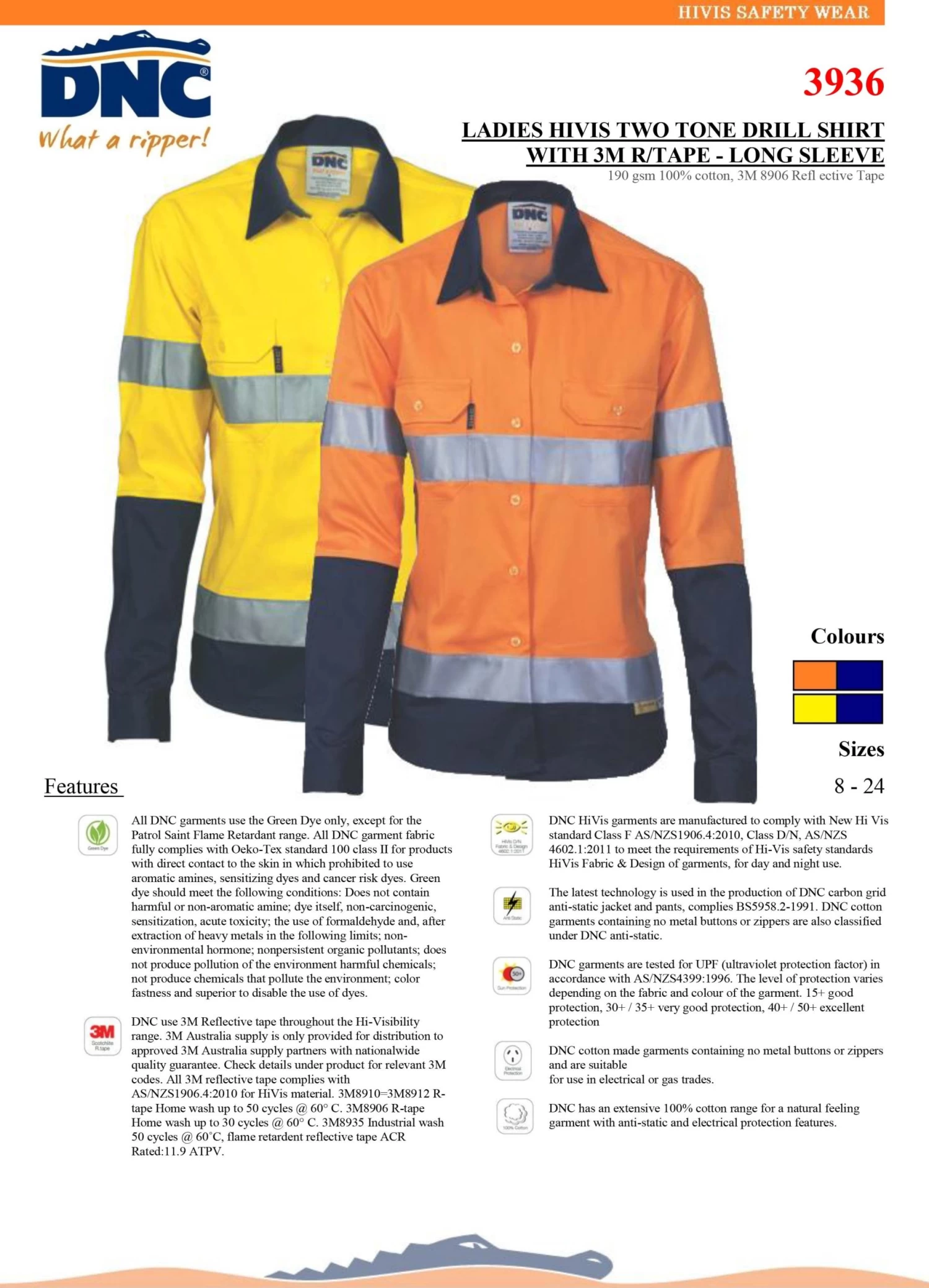 DNC HiVis garments are manufactured to comply with New Hi Vis standard Class F AS/NZS1906.4:2010, Class D/N, AS/NZS 4602.1:2011 to meet the requirements of Hi-Vis safety standards HiVis Fabric & Design of garments, for day and night use.