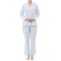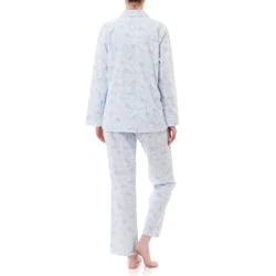 Long Pyjama in pretty blue Jewel print. This cozy fabric is perfect for chilly winter nights. Collar and full front button opening. Long sleeves with cuff. Self piping around the collar, fronts, cuffs and pocket top