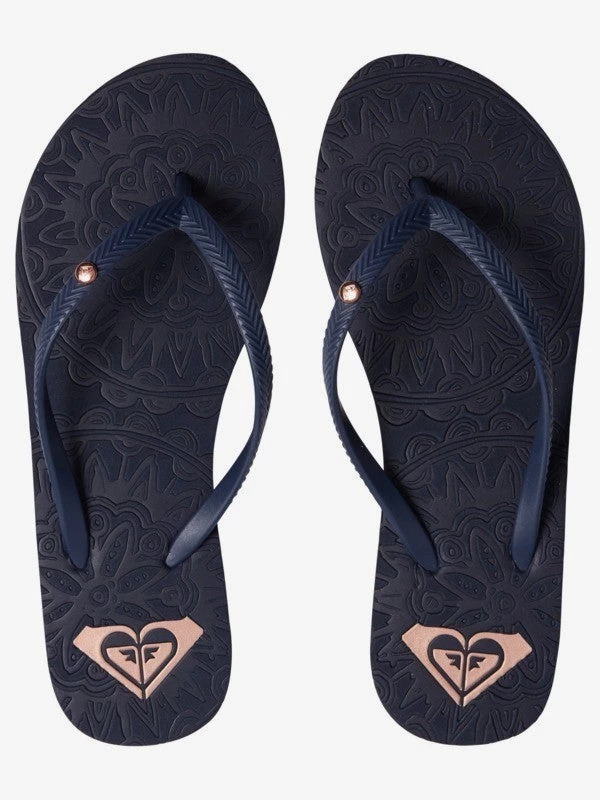 Sandals for women featuring embossed rubber footbed, and a rubber outsole with heritage ROXY print.